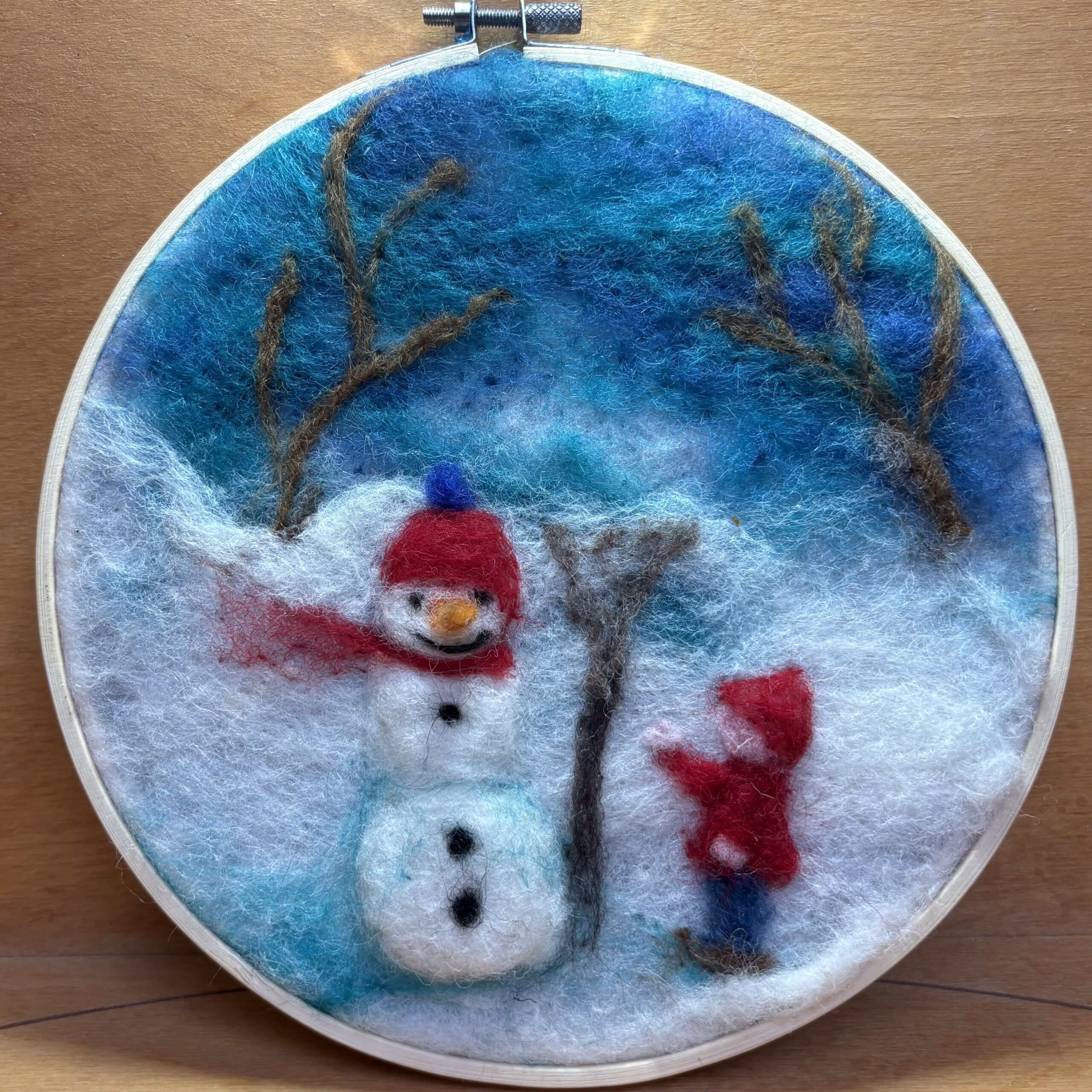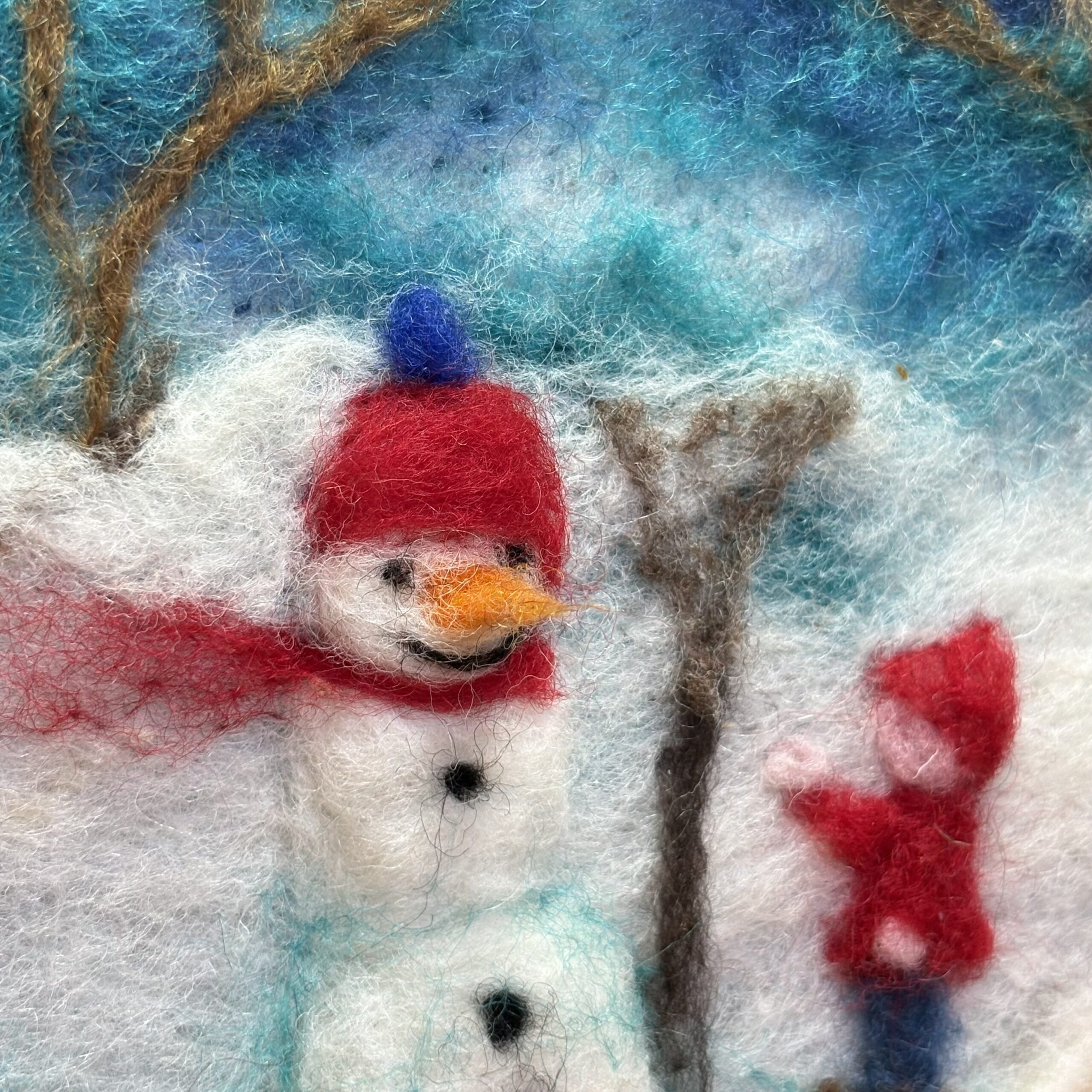 Voeg een vleugje wintermagie toe aan je interieur met dit charmante, handgemaakte wol schilderij. Met zorg en aandacht geprikt (naaldvilten), toont dit ronde kunstwerkje een sfeervol winterlandschap.