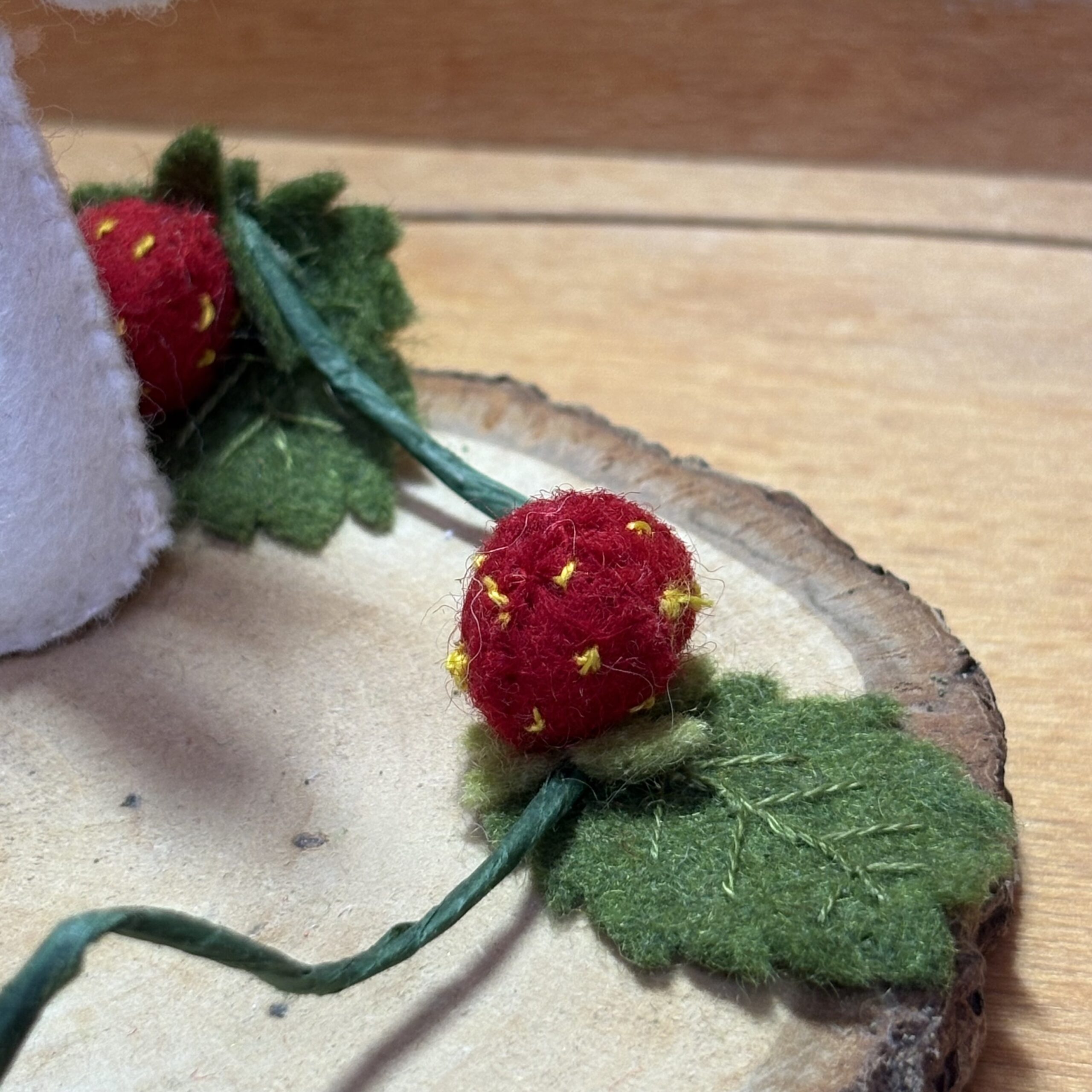 Materiaal:Â wol, vilt, tricot, pijpenrager en hout