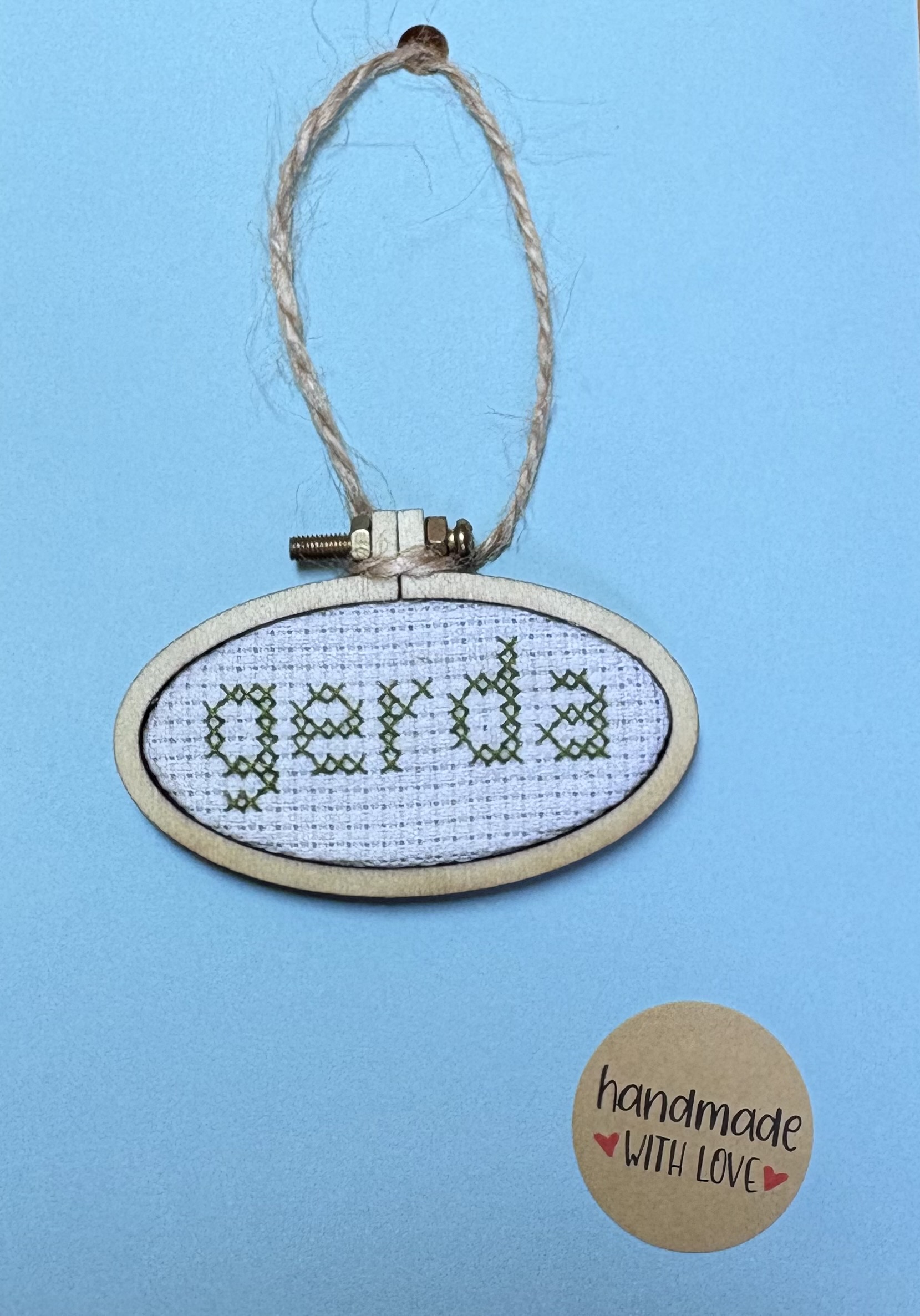 Een persoonlijk en lief geborduurd bordje in een ovaal houten lijstje met de naam Gerda. Perfect als uniek cadeautje, naamdecoratie of blijvende herinnering.