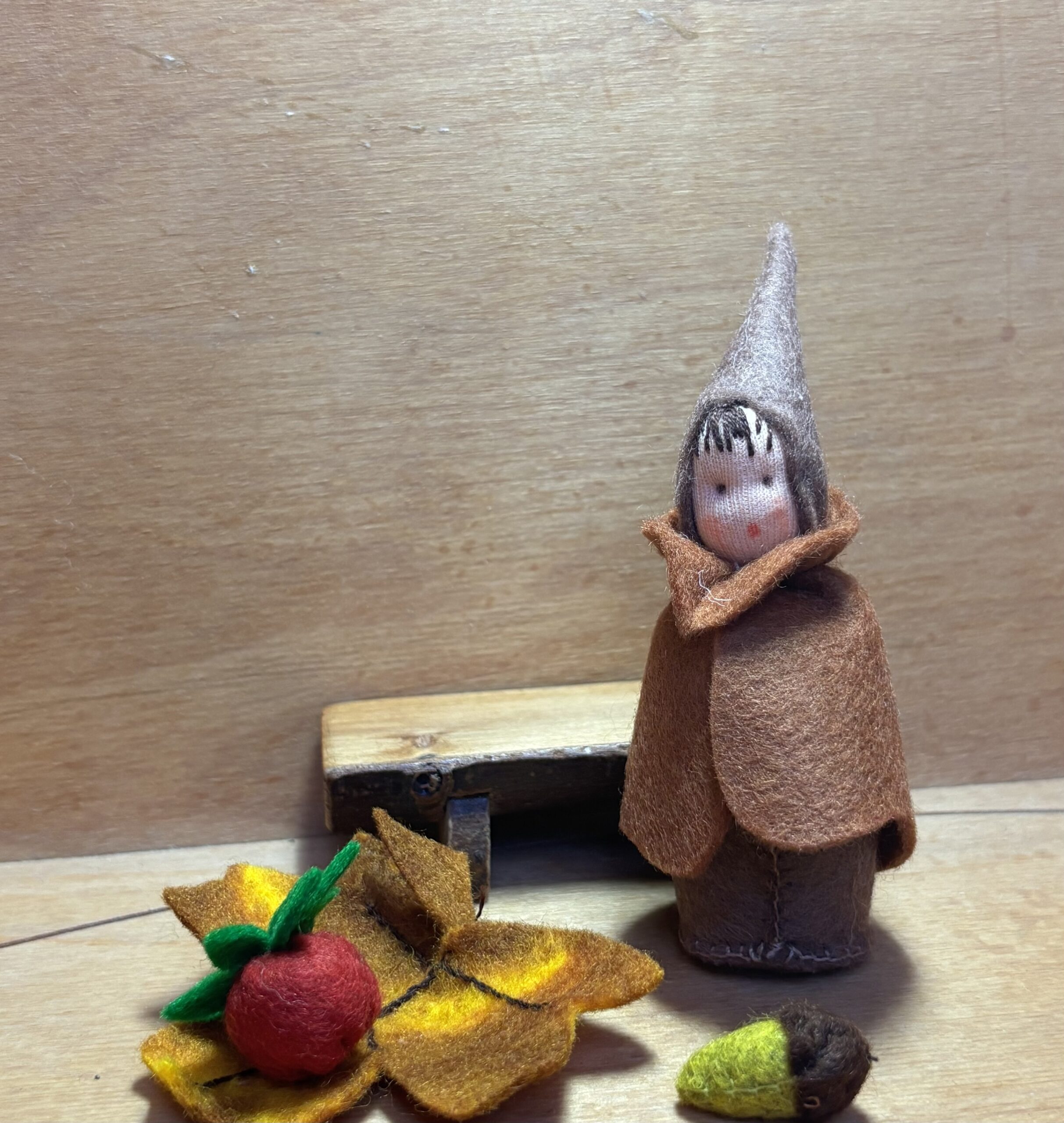 In zijn handjes draagt dit popje de schatten van de natuur: een kleurrijk herfstblad, een klein nootje en een vrolijke rozenbottel. Alles is met veel liefde en zorg handgemaakt van natuurlijke materialen zoals wol en vilt, wat zorgt voor een zachte en authentieke uitstraling.