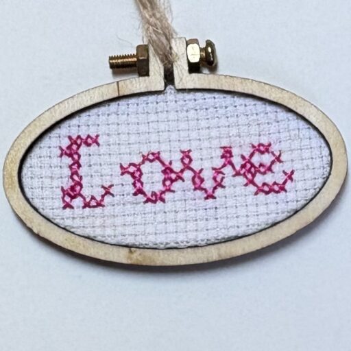 Een romantisch en handgemaakt geborduurd bordje in een houten lijstje met de tekst Love in rood. Perfect als lief cadeautje, decoratie of kleine attentie voor iemand die je dierbaar is.