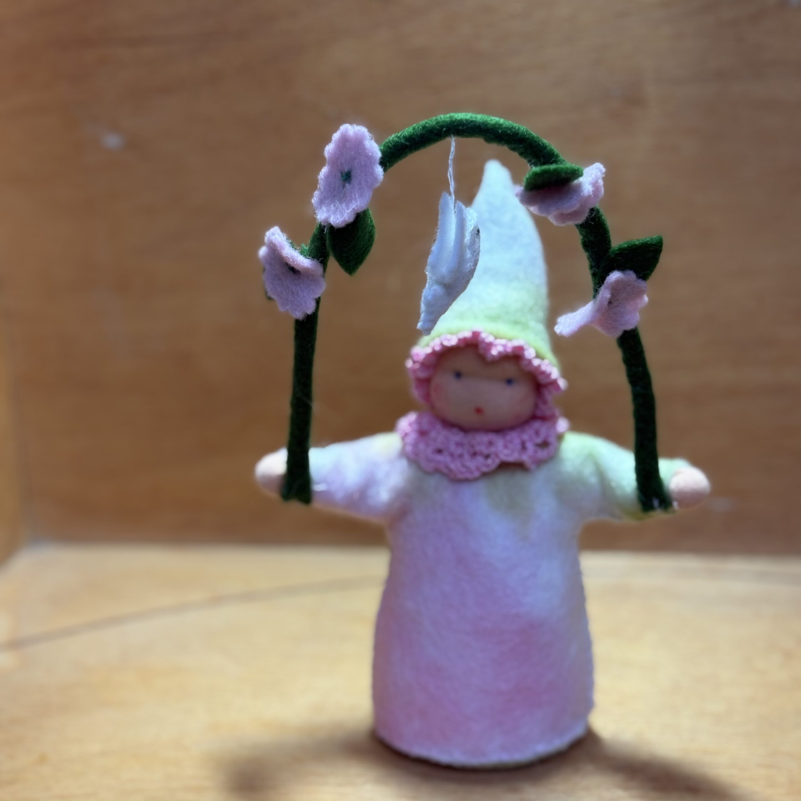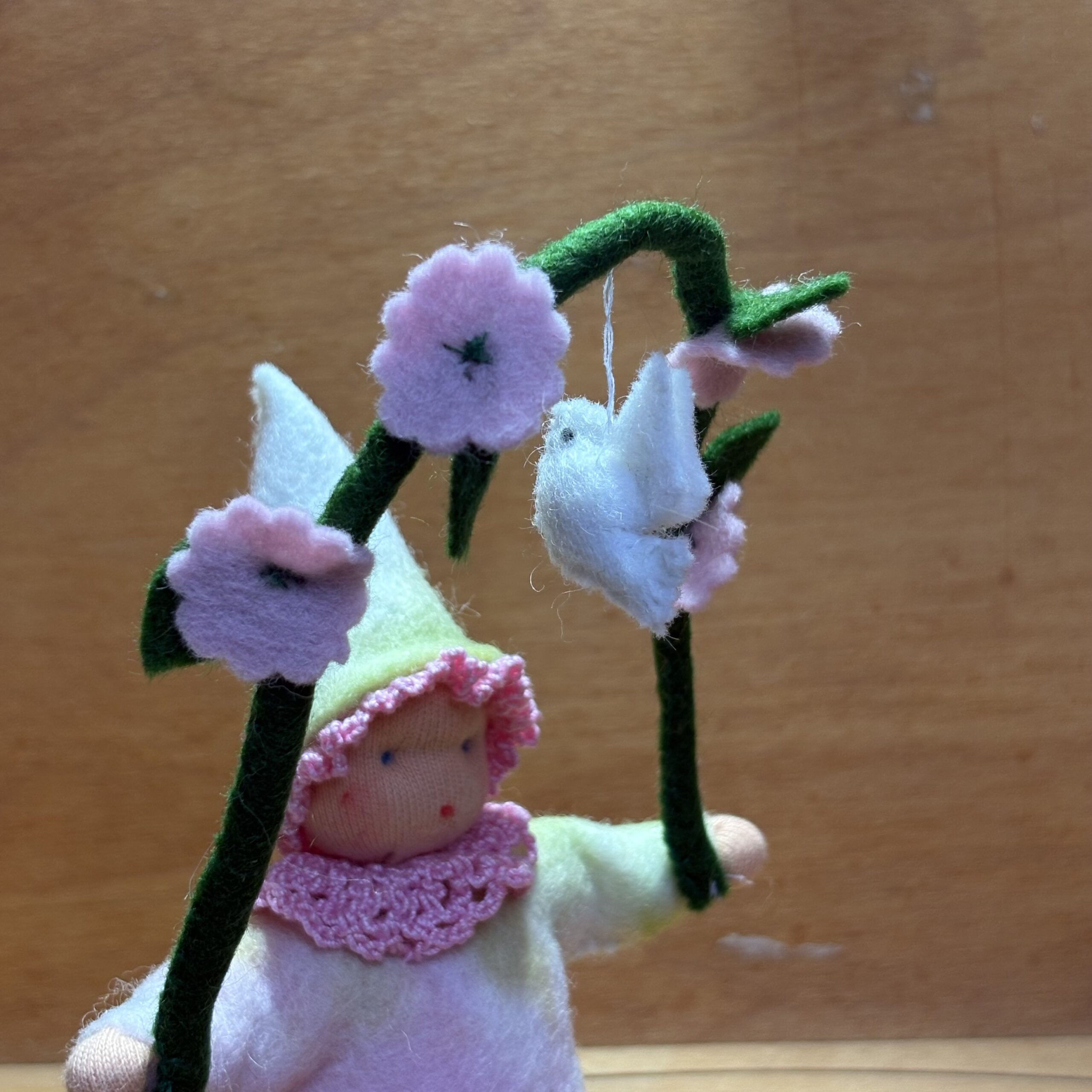 (exclusief verzendkosten)Dit meisje draagt een bloemenboog en een klein duifje, als teken dat de lente voorzichtig begint.